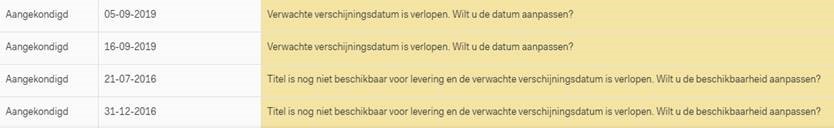 Klik op de regel, pas de datum aan en u bent klaar. Wij zorgen dat alle boekverkopers de juiste (aangepaste) datum ontvangen. Zij kunnen op hun beurt hun klanten juist informeren.
