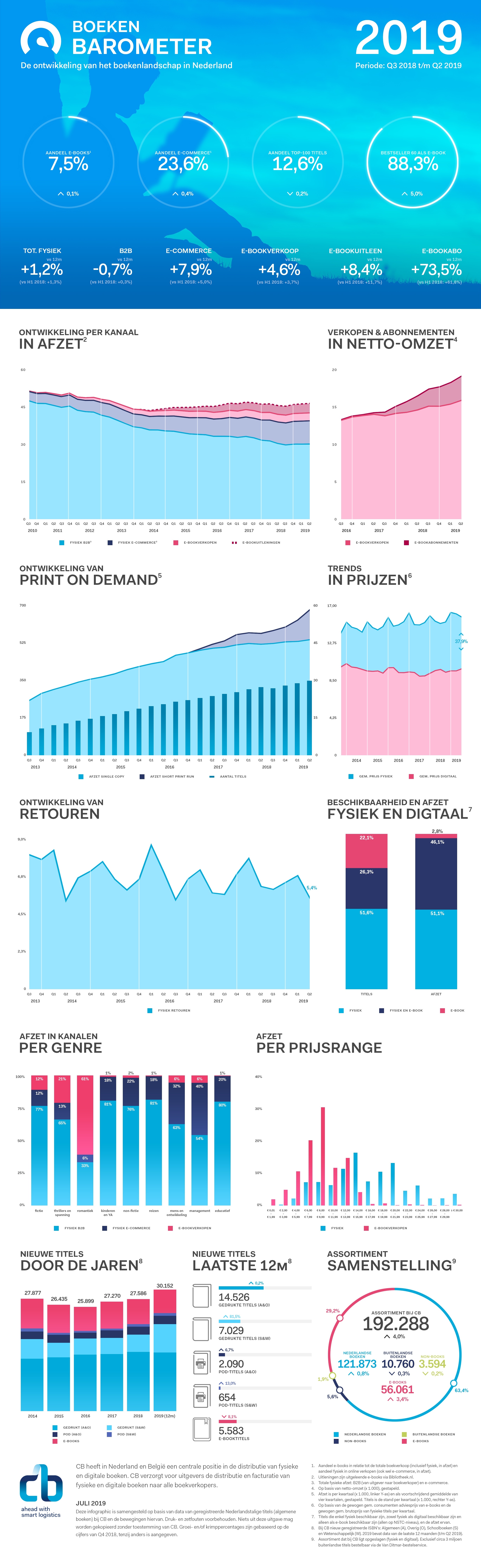 CB brengt vandaag een nieuwe boekenbarometer uit met daarin de ontwikkelingen in het Nederlandse boekenlandschap in het eerste halfjaar van 2019. De totale fysieke afzet van algemene boeken is gestegen met 1,2%, ook e-bookverkoop (+4,6%), e-bookuitleen (+8,4%) blijft groeien evenals e-bookabonnementen (stijging netto-omzet met ruim 73%).