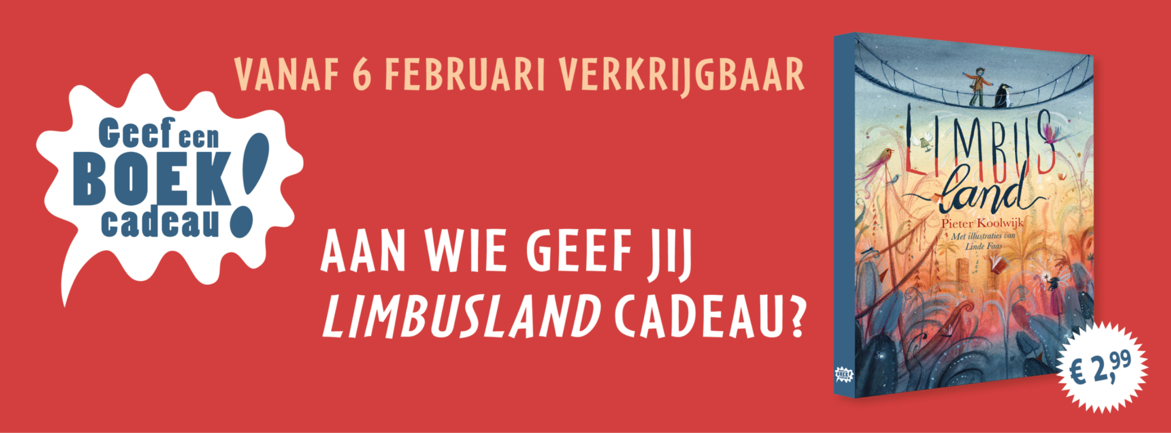 Met veel plezier en ook wel trots mochten we weer bijdragen aan de actie Geef een boek cadeau. Vanaf 6 februari ligt Limbusland van Pieter Koolwijk in de winkel voor maar € 2,99. Omdat alle kinderen de kans moeten krijgen om op te groeien tussen de mooiste boeken.