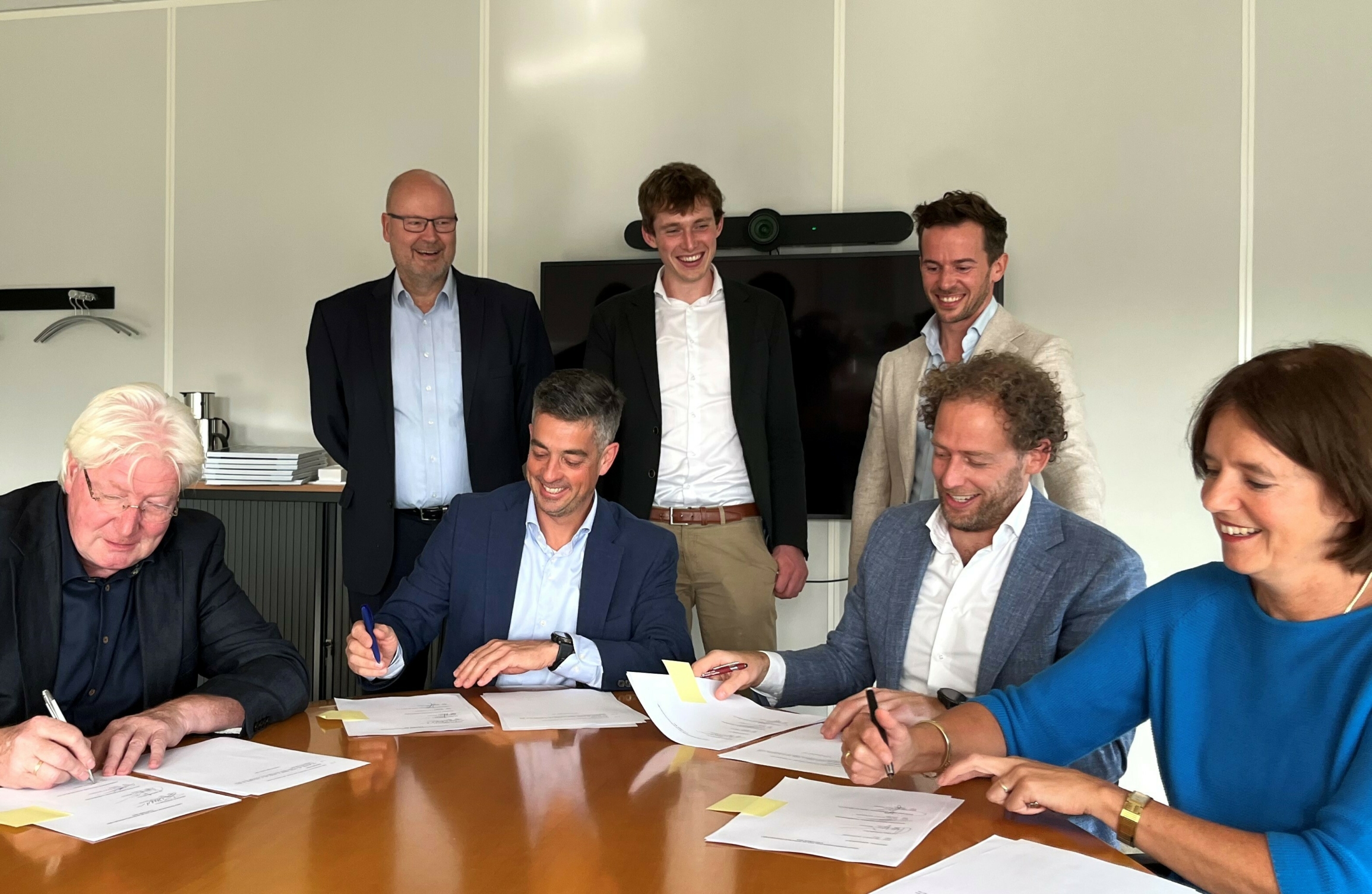 Fotobijschrift: Ondertekening van de intentieovereenkomst, vlnr Paul Janssen (Thuis en Veilig), Gertjan van Rossum (IFOZ), Joost Meyboom (CB Healthcare), Linda van Zomeren (CB).