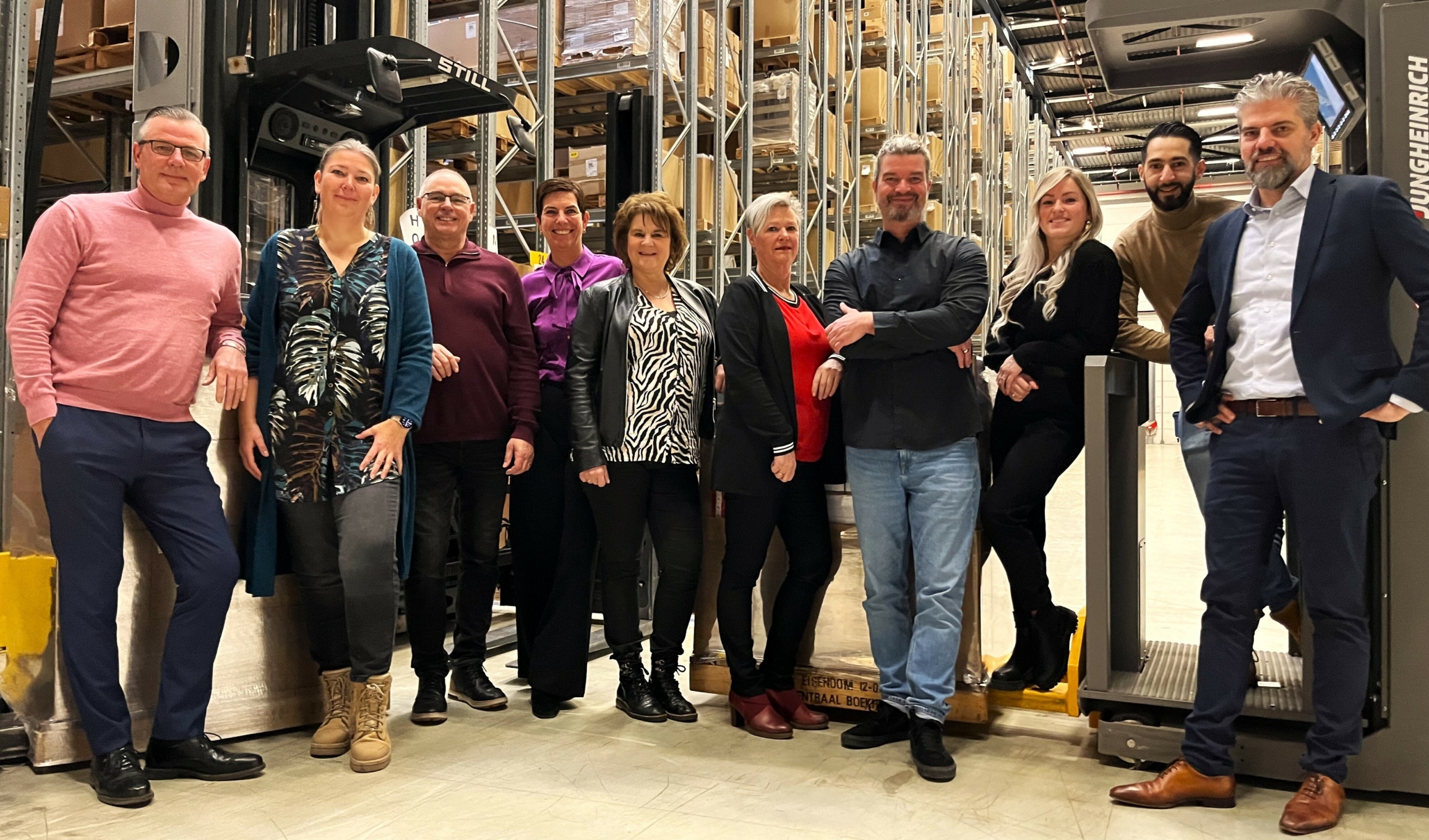 Van links naar rechts: Marco Mioch (logistiek manager), Leonie de Groot (stock and quality engineer), Jaap van der Hoofd (Customer Service), Olga van Baal (Customer Service), Patricia Gort (Customer Service), Symona Ganzeman (Customer Service), Arco Swanink (Customer Service), Madelon van den Hatert (Customer Service), Soufiane Chaït (shift leader), Jochum Winkelman (commercie).